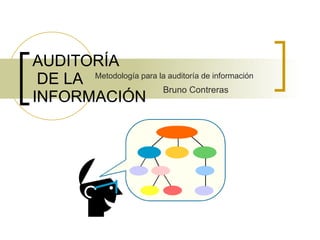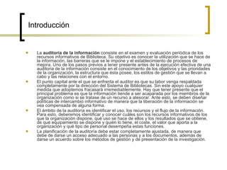El documento presenta una metodología para realizar auditorías de información en bibliotecas. Explica que la auditoría evalúa el uso y flujo de la información en una organización. Propone inventariar los recursos de información, mapear su interrelación, y analizar las necesidades de información de los usuarios a través de encuestas y entrevistas para mejorar el acceso y gestión del conocimiento.
