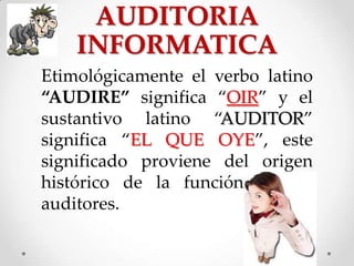 La auditoría informática es el proceso de evaluar los sistemas de información para garantizar la protección de los activos de la empresa, la integridad de los datos y el cumplimiento de los objetivos organizacionales. Se realiza para verificar el cumplimiento de la ley, identificar riesgos, mejorar la comunicación y asegurar la eficiencia en el uso de los recursos. La auditoría puede ser interna, realizada por la propia organización, o externa, llevada a cabo por una entidad independiente.