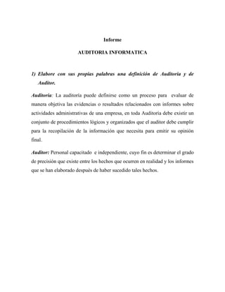El documento presenta una definición de auditoría y auditor, seguido por un mapa cronológico de la historia de la auditoría. Luego, presenta un mapa conceptual de los tipos de auditoría y un cuadro comparativo de las ventajas y desventajas de las auditorías internas y externas. Finalmente, define la auditoría informática y explica sus características y objetivos.