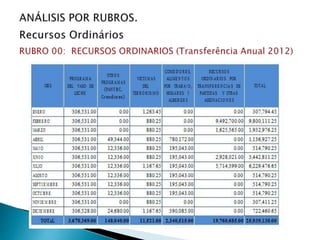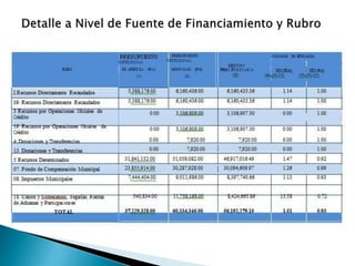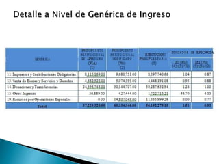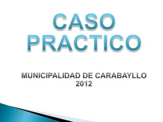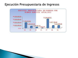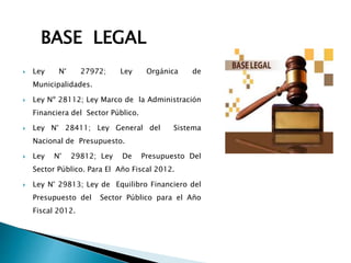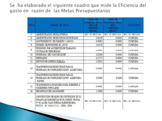 Este documento presenta la metodología para evaluar el presupuesto de una municipalidad peruana. Describe los indicadores de eficacia y eficiencia que se utilizarán para medir el desempeño presupuestario y el seguimiento a programas. También explica cómo calcular dichos indicadores y las variables a analizar como la ejecución de ingresos, gastos y metas. Finalmente, aplica la metodología para evaluar la ejecución presupuestaria del año fiscal 2012.
