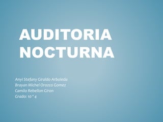 La auditoría nocturna se realiza en los hoteles por la noche para verificar el trabajo de los cajeros de recepción, verificar que los servicios se hayan cobrado correctamente según las tarifas, y separar los ingresos por departamento. El auditor nocturno revisa los reportes de ventas y cuadra los ingresos obtenidos durante la noche para facilitar el trabajo del auditor de ingresos.