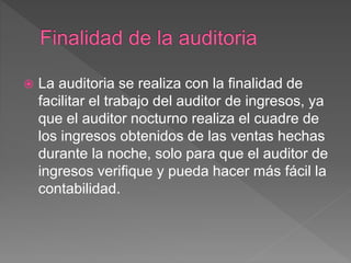 El documento describe los procedimientos de auditoría nocturna en un hotel. El auditor nocturno revisa los ingresos del día de diferentes departamentos como recepción, alimentos y bebidas, banquetes, lavandería y teléfonos. Realiza un cuadre de caja, verifica los cargos a cuentas por cobrar y postea ingresos de habitaciones, restaurantes, propinas, bebidas, renta de salones y teléfonos. El objetivo es facilitar la contabilidad y proporcionar información financiera diaria al hotel.