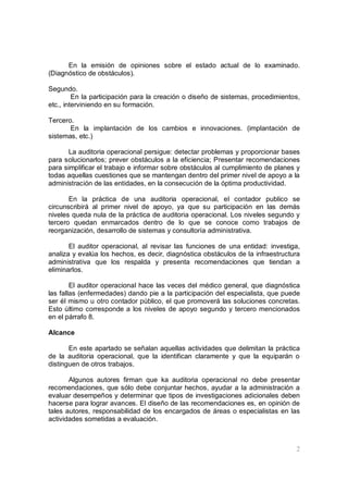 Este documento define la auditoría operacional como un servicio que examina la eficiencia de una entidad y presenta recomendaciones para mejorarla. Explica que la auditoría operacional se enfoca en diagnosticar problemas, prever obstáculos y simplificar procesos. También distingue la auditoría operacional de la auditoría interna y externa, señalando que la primera se enfoca en la eficiencia mientras que las otras se enfocan en la información financiera y contable. Finalmente, indica algunas situaciones comunes en las que se aplica la auditoría operacional,
