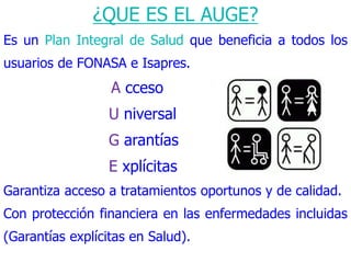 El AUGE es un Plan Integral de Salud que garantiza el acceso universal y oportuno a tratamientos de calidad para 80 enfermedades comunes y graves, incluyendo cáncer, enfermedades del corazón, diabetes, VIH/SIDA, entre otras. El plan proporciona cuatro garantías: acceso a la atención, oportunidad en la atención, protección financiera y calidad en la atención. Los beneficiarios de FONASA y las Isapres tienen derecho a recibir los tratamientos definidos para cada enfermedad cubierta en el