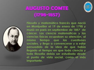 El documento resume las teorías sociológicas de Augusto Comte y Emilio Durkheim. Comte propuso la ley de las tres etapas y clasificó las ciencias teóricas. Definió la sociología como el estudio de los fenómenos sociales y propuso una sociología estática y dinámica. Durkheim definió la sociología como la ciencia de los hechos sociales e instituciones. Propuso sociedades mecánicas y orgánicas y fue fundador del análisis estructural-funcional en
