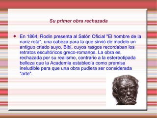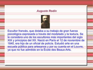 Auguste Rodin fue un escultor francés del siglo XIX conocido por dotar a sus obras de gran fuerza psicológica a través del modelado y la textura. Algunas de sus obras más famosas incluyen "El pensador", "Los burgueses de Calais" y representaciones audaces de la belleza femenina que desafiaron los tabúes de la época. Tuvo una relación tumultuosa con su alumna Camille Claudel que terminó en separación, lo que llevó a Claudel a la depresión y la locura.