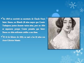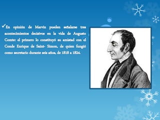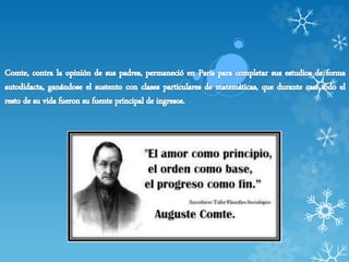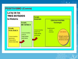 El documento describe la "Ley de los Tres Estados" que propone que la humanidad ha pasado por tres estados en su comprensión del mundo: 1) Un estado teológico o ficticio caracterizado por el fetichismo y el politeísmo, 2) Un estado metafísico o abstracto, y 3) Un estado positivo o científico basado en hechos observables.