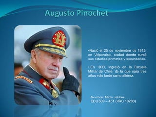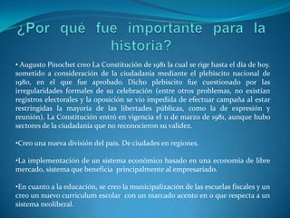Augusto Pinochet encabezó un golpe de Estado en 1973 que derrocó al gobierno democrático de Salvador Allende. Pinochet gobernó Chile de forma autoritaria hasta 1990, implementando una economía neoliberal y reprimiendo fuertemente a la oposición política y sindical, lo que resultó en miles de muertes y desapariciones.