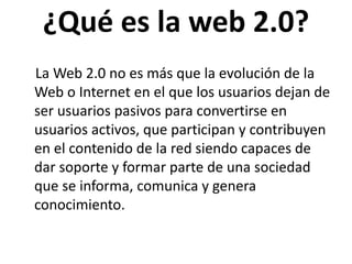 El documento define la Web 2.0 como la evolución de la Web tradicional en la que los usuarios dejan de ser pasivos para convertirse en activos, participando y contribuyendo al contenido. Describe las características de la Web 2.0 como permitir que los usuarios creen contenido y aplicaciones, y facilitar la colaboración y compartición de información. Finalmente, explica que los foros de discusión y las listas de distribución sirven para que los usuarios opinen y compartan información sobre temas de interés común.