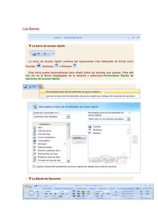 Este documento proporciona una introducción a los elementos básicos de Excel, incluyendo las barras de herramientas, opciones de menú, formas de moverse por hojas y celdas, e introducir diferentes tipos de datos como valores constantes y fórmulas. También explica cómo detectar y corregir errores comunes en los datos y fórmulas.