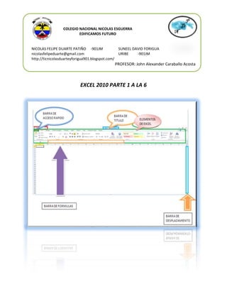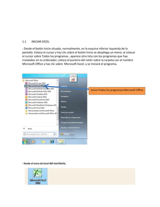 Este documento presenta una introducción a Excel 2010 en 6 partes. Explica cómo iniciar Excel, identificar los componentes principales de la interfaz como la cinta de opciones, barras y pestañas. También cubre temas como introducir y modificar datos, moverse dentro y entre hojas, y obtener ayuda. El objetivo es proporcionar una guía básica para aprender las funciones y herramientas fundamentales de Excel.