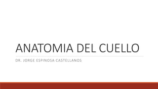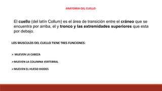 El documento resume la anatomía de los músculos del cuello. Se dividen en músculos anteriores, laterales y posteriores. Los músculos anteriores incluyen los suprahioideos (digástrico, milohioideo) e infrahioideos (esternocleidohioideo, omohioideo), que mueven la mandíbula y laringe. Los músculos laterales son el esternocleidomastoideo y los escalenos, que rotan y flexionan el cuello. Los músculos posteriores como el trapec