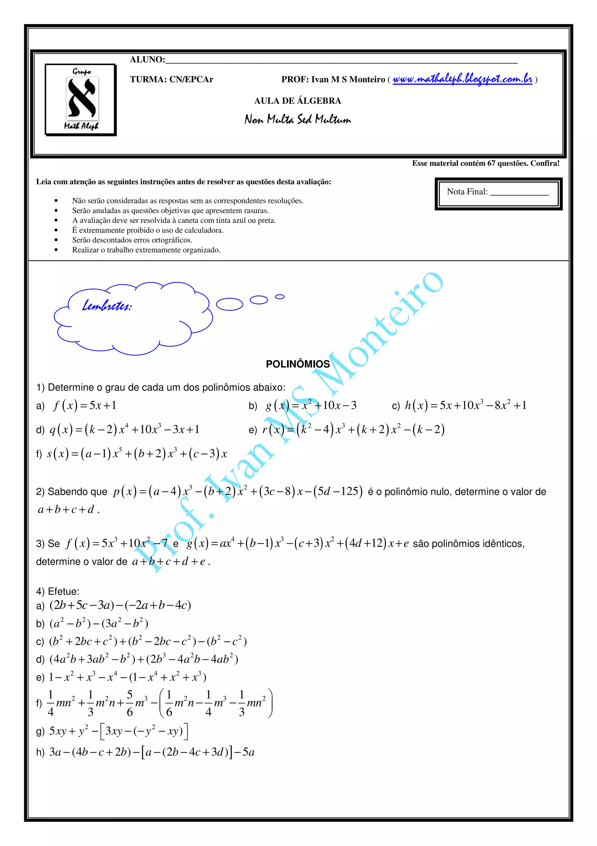 Este documento contiene instrucciones para una evaluación de álgebra con 67 preguntas. Las instrucciones indican que no se considerarán las respuestas sin resoluciones, que se anularán las preguntas objetivas con raspaduras y que la evaluación debe resolverse a mano con tinta azul o negra. Además, está prohibido el uso de calculadora y se descontarán errores ortográficos.