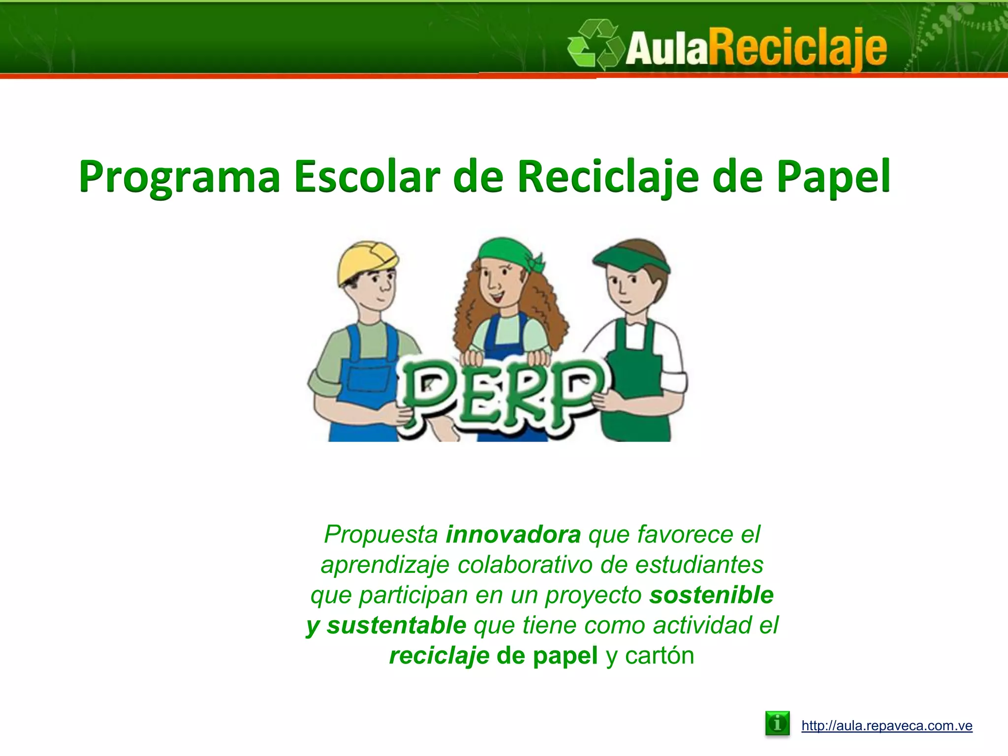 El documento propone un programa escolar de reciclaje de papel que permite a los estudiantes participar en un proyecto sustentable y sostenible de reciclaje. Los estudiantes recolectan y venden papel para recaudar fondos para la escuela, aprendiendo sobre conceptos como sustentabilidad y responsabilidad social. El programa utiliza materiales multimedia, como un sitio web y libros electrónicos, para guiar a los estudiantes y maestros en el proceso de reciclaje.