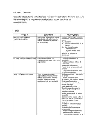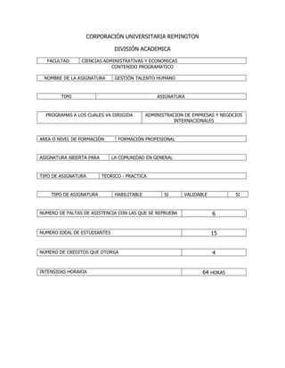 Este documento presenta la información del contenido programático de la asignatura de Gestión de Talento Humano en la Facultad de Ciencias Administrativas y Económicas de la Corporación Universitaria Remington. La asignatura busca capacitar a los estudiantes en técnicas de desarrollo del talento humano y cubre temas como la administración, selección, capacitación, motivación y evaluación del desempeño del personal. La enseñanza se realizará a través de trabajo individual, grupal y colaborativo evaluando aspectos como