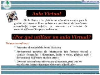 El documento habla sobre el uso de aulas virtuales en la educación. Explica que las aulas virtuales permiten presentar material de forma didáctica utilizando recursos multimedia, y ofrecen herramientas para la interacción entre estudiantes y facilitadores. También destaca la importancia de que los docentes faciliten la motivación de los estudiantes y los involucren en su propio aprendizaje para mejorar el proceso de enseñanza-aprendizaje.