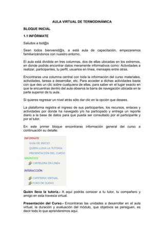 Este documento presenta la introducción de un curso virtual de termodinámica. Explica que el curso se dividirá en tres bloques: inicial, académico y de cierre. En el bloque inicial, los estudiantes se presentarán y familiarizarán con el entorno virtual. El bloque académico cubrirá los contenidos de la termodinámica a través de foros, tareas y exámenes parciales. El documento también incluye los objetivos del curso, requisitos previos, contenido del programa y detalles
