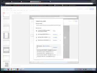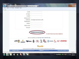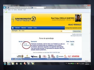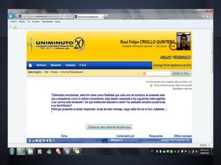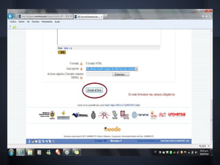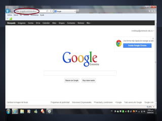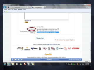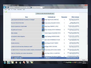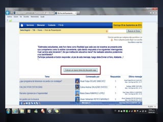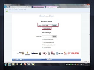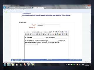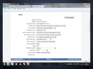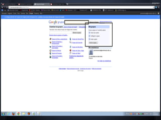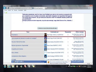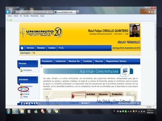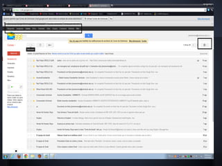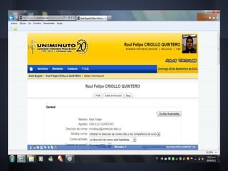 El documento resume las funciones básicas de gestión de información en el aula virtual y correo institucional como actualizar el perfil, usar el sistema de mensajería, participar en foros, crear firmas de correo, hacer grupos y compartir documentos. Explica cómo enviar y recibir mensajes, crear grupos y documentos en el correo institucional.