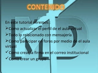 Este documento explica cómo actualizar el perfil en el aula virtual, cómo enviar y recibir mensajes, cómo participar en foros, cómo crear una firma en el correo institucional, y cómo crear un grupo. Para actualizar el perfil, se debe ingresar al aula virtual y seleccionar la opción "Actualizar información personal". Para enviar y recibir mensajes, se debe buscar la barra azul en la parte inferior y seleccionar el icono de sobre. Para participar en foros, se debe buscar la opción "Foros" en el lado izquierdo