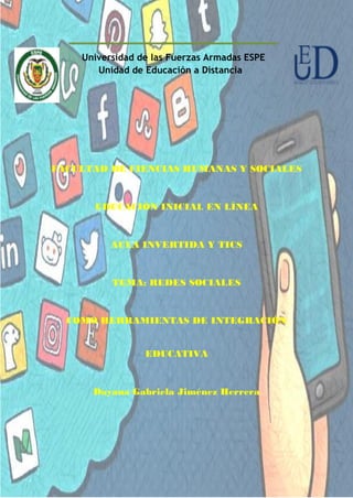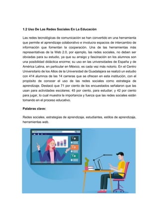 El documento describe el uso creciente de las redes sociales como herramientas educativas. Un estudio encontró que el 71% de los estudiantes usan las redes sociales para actividades escolares y el 45% para estudiar. Se proporciona un cuadro con 8 redes sociales populares como Facebook, Instagram, LinkedIn, Twitter y más, describiendo brevemente cada una. Finalmente, se pide al lector crear cuentas en varias redes y encontrar ejemplos de su uso educativo.