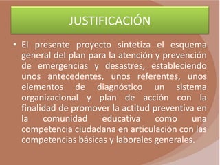 El documento presenta un plan para la atención y prevención de emergencias y desastres en una institución educativa. Incluye un diagnóstico de la situación actual, la formación de comités, la capacitación a la comunidad educativa, la realización de simulacros, y acciones concretas como mejorar las rutas de evacuación y la señalización. El objetivo general es promover una cultura de prevención que permita a la comunidad educativa responder de manera organizada en caso de una emergencia.
