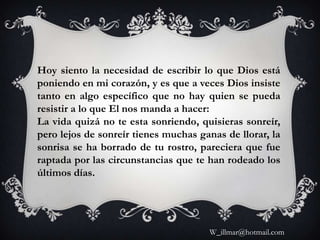 El autor reflexiona sobre la lucha emocional que enfrentan las personas cuando sienten que Dios no les sonríe o se sienten abandonadas. A pesar de los pensamientos negativos y la desesperación, el mensaje central es que Dios siempre está presente y dispuesto a ofrecer amor y apoyo, alentando a las personas a rendirse a su voluntad. Se invita a la audiencia a encontrar consuelo y renovar su esperanza a través de la fe en Dios.