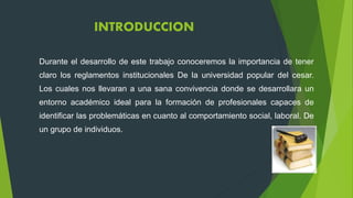 El reglamento institucional de la Universidad Popular del Cesar establece normas obligatorias para la comunidad educativa, asegurando una convivencia adecuada y el desarrollo académico y organizativo. Este reglamento detalla derechos, deberes, procedimientos disciplinarios y lineamientos para cambios de carrera y sanciones, buscando así mantener un ambiente académico ideal. Conocer y aplicar estas normas es crucial para salvaguardar los derechos de los estudiantes y asegurar un funcionamiento adecuado de la institución.
