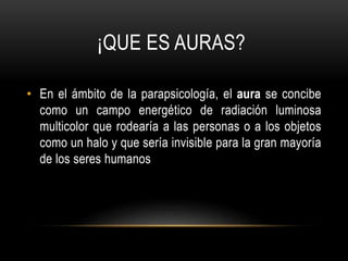 El documento describe el aura, un campo energético multicolor que rodearía a las personas. Explica dos pasos para ver el aura y los significados de los colores más comunes como el rojo, naranja, amarillo y verde que representan características como la ambición, sociabilidad y determinación. También habla de otros colores como azul, índigo, violeta, rosa y sus asociaciones con la espiritualidad, sensibilidad y creatividad.
