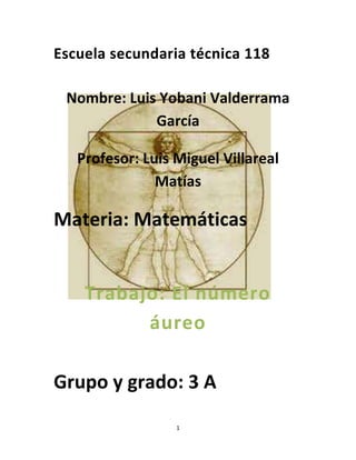 El documento presenta información sobre el número áureo, también conocido como la razón áurea o divina proporción. Explica que este número irracional, aproximadamente 1,618, describe la proporción entre dos segmentos de una línea dividida en la razón áurea. Además, señala que el número áureo se encuentra con frecuencia en la naturaleza y el arte, y está relacionado con la serie de Fibonacci.