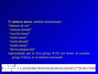 El documento describe el número áureo, también conocido como la sección áurea o razón áurea, que representa una proporción irracional que se encuentra con frecuencia en la naturaleza y en obras de arte. Esta proporción se ha utilizado desde la antigua Grecia en construcciones como el Partenón y en Egipto en las pirámides. Artistas como Leonardo da Vinci y Dalí incorporaron esta proporción en obras maestras como La última cena y Leda atómica.