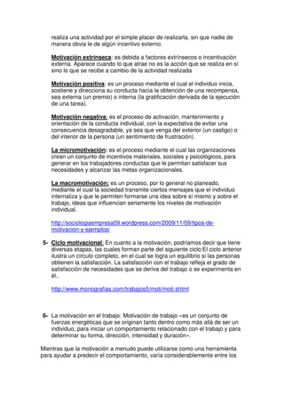 El documento trata sobre el tema de la motivación. Define la motivación y explica la diferencia entre motivación y satisfacción. También describe la teoría de la jerarquía de necesidades de Maslow y los diferentes tipos de motivación como intrínseca y extrínseca. Explica el ciclo motivacional y cómo la motivación afecta el comportamiento en el trabajo y las organizaciones. Finalmente, concluye que la motivación de los trabajadores es importante para el rendimiento de las empresas pero requiere de políticas adecuadas y profesionales capacitados.