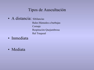 I. El documento describe diferentes tipos de auscultación pulmonar como mediata e inmediata y los sonidos respiratorios normales y anormales que se pueden detectar, incluyendo soplos tubarios, pleuríticos y cavernosos. II. También explica diversos ruidos respiratorios accesorios como rales secos y húmedos, sibilancias y crepitantes, así como frotes pleurales. III. Finalmente, revisa la auscultación de la voz y signos como broncofonía, pectoriloquía y voz anf