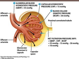 El riñón tiene múltiples funciones como la excreción de desechos, la regulación del volumen sanguíneo y la composición iónica de la sangre. La formación de la orina implica la filtración glomerular del plasma sanguíneo, la reabsorción tubular selectiva de agua y solutos y la secreción tubular de sustancias. La filtración glomerular depende de la presión hidrostática en el glomerulo y está regulada por mecanismos locales y sistémicos. La composición final de la orina se controla a través de