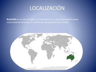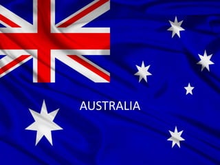 Australia es un país insular ubicado en Oceanía. Tiene una bandera con seis estrellas que representan la constelación de la Cruz del Sur, importante en el hemisferio sur. Los aborígenes australianos fueron los primeros habitantes y crearon artefactos como el boomerang. El inglés es el idioma oficial aunque se hablan más de 200 idiomas debido a la diversidad cultural. Algunos animales nativos incluyen koalas, canguros y el demonio de Tasmania. El fútbol australiano es el deporte más popular y las principales ci