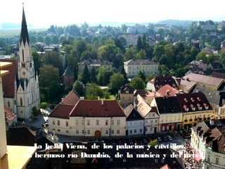 Este documento presenta una introducción a Viena, la capital de Austria, describiendo sus principales atracciones como el río Danubio, la música, el arte, la cultura y los palacios históricos. Resalta la belleza de la ciudad en todas las estaciones y destaca lugares emblemáticos como el Palacio de Schönbrunn, la Abadía de Melk y el Teatro Municipal de Viena. También describe paisajes idílicos a lo largo del río Danubio con viñedos y pequeños pueblos que cultivan la vid.