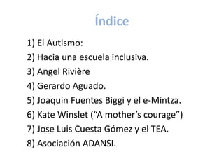 El documento trata sobre el autismo. Explica los diferentes grados del autismo como el trastorno autista, el autismo regresivo y el de alto funcionamiento. También habla sobre formas de comunicación para personas autistas como tarjetas y agendas visuales. Describe además diferentes expertos en autismo como Angel Rivière, Gerardo Aguado y Joaquín Fuentes Biggi que creó el programa e-Mintza para la comunicación de personas autistas.