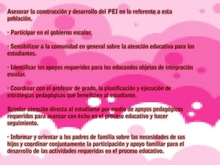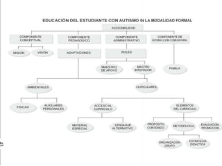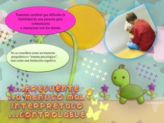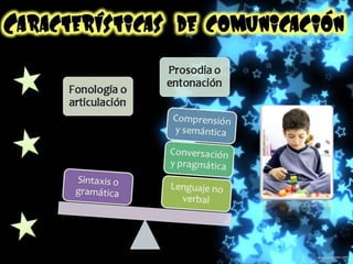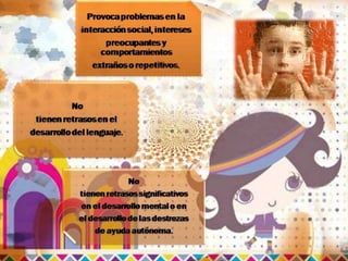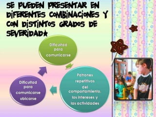 Este documento describe las características principales del trastorno del espectro autista (TEA), incluyendo dificultades en la comunicación, interacción social y comportamientos repetitivos. También discute las funciones cognitivas afectadas y los apoyos recomendados para personas con TEA.