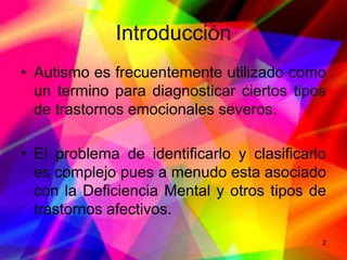 El autismo es un trastorno del desarrollo que implica dificultades en la interacción social, la comunicación y comportamientos repetitivos. Se caracteriza por alteraciones cualitativas en la interacción social, la comunicación y patrones de comportamiento. El diagnóstico requiere la presencia de deficiencias en estas tres áreas.