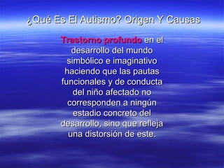 Este documento describe el autismo, sus causas y evaluación. Resume que el autismo es un trastorno del desarrollo que afecta la comunicación y las interacciones sociales. Puede ser causado por factores genéticos o durante el embarazo. La evaluación incluye observación del niño, pruebas iniciales e hipótesis sobre su comportamiento.