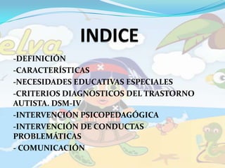 Este documento proporciona información sobre el trastorno autista. Define el trastorno y sus características clave como déficits en la interacción social, comunicación y comportamientos repetitivos. Explica las necesidades educativas especiales de las personas con autismo y los criterios de diagnóstico. También cubre estrategias de intervención como el uso de apoyos visuales y la evaluación del entorno educativo.