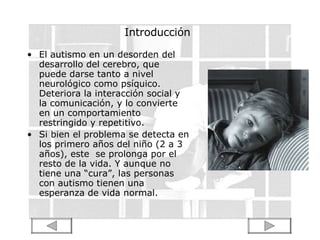 El documento describe el autismo como un trastorno del desarrollo del cerebro que afecta la interacción social y la comunicación. Aunque no tiene cura, el tratamiento temprano como el Análisis Conductual Aplicado puede mejorar el funcionamiento. El autismo parece tener causas tanto genéticas como ambientales que afectan el desarrollo del cerebro prenatalmente, aunque las causas específicas son difíciles de determinar.