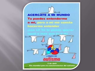 Este documento describe el autismo, incluyendo sus características, causas y diagnóstico. Explica que el autismo es un trastorno neurológico complejo que dura toda la vida y afecta la comunicación y las relaciones sociales. Aunque las causas son desconocidas, se diagnostica cada vez más temprano para iniciar intervención temprana, la cual puede mejorar significativamente la calidad de vida de los niños con autismo. El documento también enumera algunas características comunes en niños autistas como lenguaje limitado, ecolalia