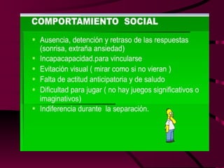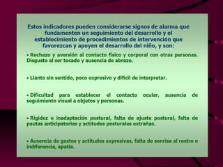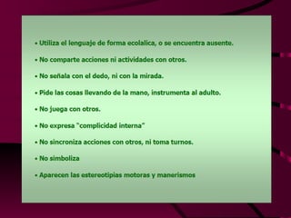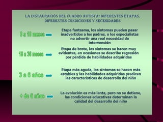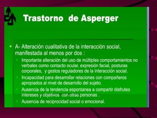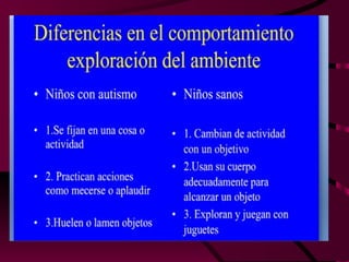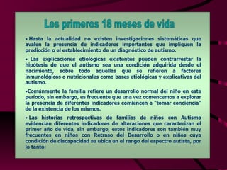 El documento proporciona información sobre el autismo y su historia. Menciona que el término fue utilizado por primera vez en 1944 y describe las diferencias en cómo Kanner y Asperger interpretaron los comportamientos observados. También explica que el "Espectro Autista" fue acuñado en 1979 y enumera algunas de las características clave. Además, brinda detalles sobre el diagnóstico y las pruebas utilizadas para evaluar el autismo.