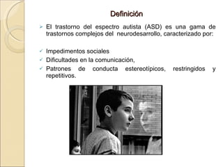 El documento proporciona una definición y descripción general del trastorno del espectro autista. Explica que se caracteriza por dificultades en la comunicación y las interacciones sociales, así como por patrones de comportamiento repetitivos. Además, discute la epidemiología, causas, diagnóstico, características evolutivas y tratamientos del autismo.