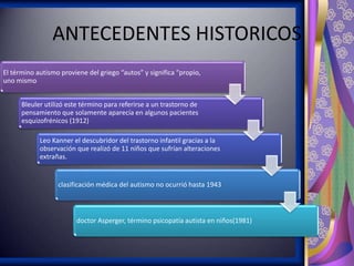 Este documento describe la historia y características del autismo. Se menciona que el término fue acuñado originalmente por Bleuler y que Kanner identificó el trastorno infantil. Actualmente se clasifica como un trastorno del espectro autista que se caracteriza por dificultades en la comunicación, interacción social y patrones de comportamiento repetitivos. Las causas son multifactoriales e incluyen factores genéticos y ambientales.