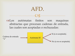 Este documento describe los autómatas finitos deterministas (AFD). Explica que un AFD es una máquina abstracta que procesa cadenas de entrada y las acepta o rechaza dependiendo de si el estado final alcanzado es de aceptación o no. Define los cinco componentes de un AFD y cómo se mueve la unidad de control al leer los símbolos de la cadena de entrada según la función de transición. Finalmente, da un ejemplo para ilustrar el proceso de aceptación de una cadena.