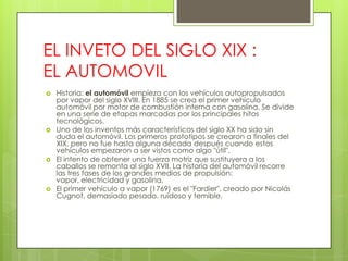 El documento resume la historia del automóvil desde sus inicios en el siglo XVIII con vehículos autopropulsados por vapor hasta su invención como motor de combustión interna a gasolina en 1885. Explica que los primeros prototipos de automóvil se crearon a finales del siglo XIX pero no fue hasta inicios del siglo XX cuando empezaron a ser vistos como útiles y su producción masiva, con empresas pioneras como Panhard et Levassor y Peugeot en Francia y con Henry Ford y su cadena de montaje en Estados Unidos.