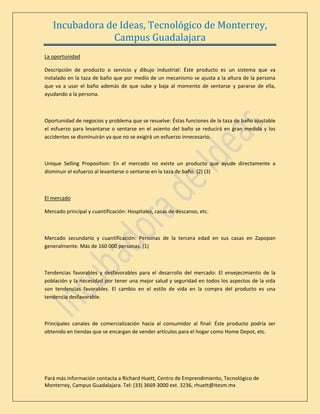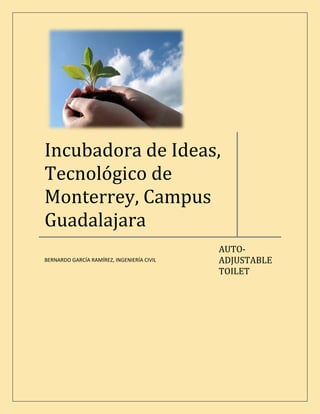 El documento describe un sistema de taza de baño autoajustable diseñado para reducir el esfuerzo requerido para sentarse y levantarse. El sistema ajustaría la altura de la taza al usuario y subiría/bajaría cuando se siente o se levanta. Esto reduciría los accidentes y esfuerzos innecesarios para personas mayores. No existe un producto similar actualmente en el mercado. El mercado objetivo incluye hospitales y hogares de ancianos. Se necesitaría investigación y desarrollo para optimizar la tecnología y diseñ