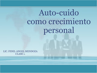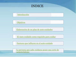 Este documento habla sobre el auto-cuidado como un requisito para cuidar de los demás y como un proceso de crecimiento personal. Define el auto-cuidado como el cuidado que una persona se da a sí misma y señala que factores como la cultura, la familia y experiencias previas influyen en el nivel de auto-cuidado. Finalmente, indica que una persona que se cuida bien tiene conocimiento propio, autoestima positiva y la capacidad de adaptarse.