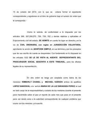 Pedrito Pérez y María Mercedes López Sandoval presentaron un escrito ante el Juzgado Mixto de Primera Instancia del Vigésimo Tercer Partido Judicial en Atotonilco el Alto, Jalisco para solicitar la adopción simple de dos menores, Kimberly Chanel y Michael Karden López Sandoval. El juez admitió el caso y ordenó formar el expediente correspondiente. También aceptó a María de la Luz Zaragoza Pérez como tutora temporal de los menores durante el proceso y designó a los abogados Benjamín Ortiz Pérez y